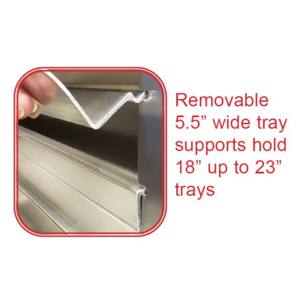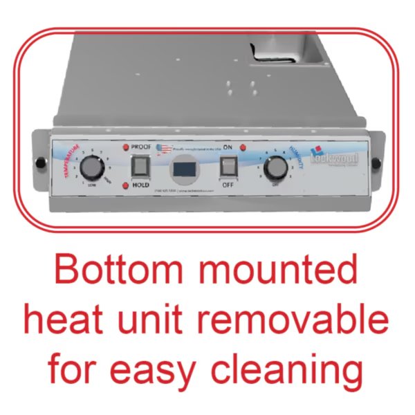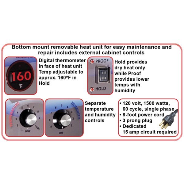 All aluminum construction. 16 removable tray slides provides 3" spacing adjustable at 1.5" intervals. Bottom mounted heat unit is easily removable for cleaning and repair. Dual purpose cabinet - use for proofing or holding. Proof mode provides lower temperatures and humidity (use with distilled water only). Hold mode provides dry heat up to 160 degrees. 8 foot power cord with 3 prong plug requires 15 amp dedicated non-GFI circuit. 6" plate casters (2 with brakes). Ships fully assembled via truckline. ETL listed