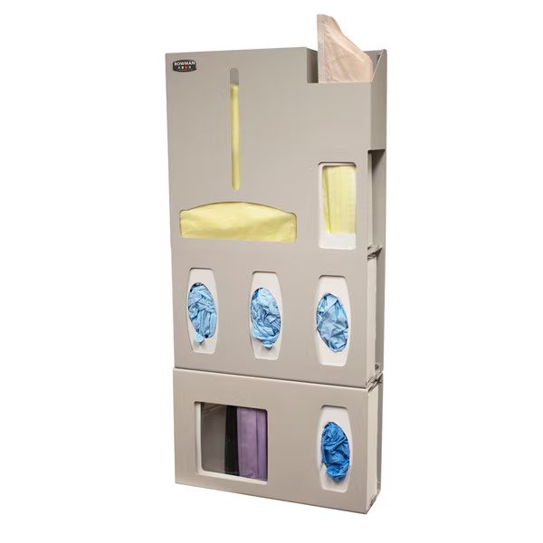 Protective Wear Dispenser - Glove & Mask; Holds one box of gloves or tissues and one box of shields, boxed gowns, or two boxes of earloop masks; Keyholes for wall mounting or attaches to the bottom of the PS019-0212, Quartz Beige ABS Plastic, .