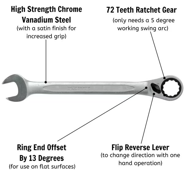 SAE ratcheting combination ring/open ended spanner with 72 teeth and 12 point ring ratchet with flip reverse. The spanner is offset at a 13 degrees angle and has the same size at both ends. Made from chrome vanadium with a satin finish.