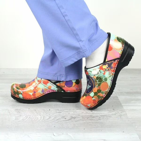Lava lamp pattern, patent leather. Padded Instep. Certified Slip Resistant. Cushioned microfiber insole. Rocker Bottom. Anatomically correct footbed with breathable cushioned microfiber insole