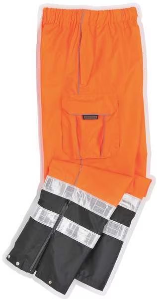 Rain Pants, Material Polyester, Gender Unisex, Size 3XL, Color Orange, Inseam 32 in, Maximum Waist Size 48 in, High-Visibility Yes, ANSI Class E, ANSI Type Unrated, Number of Outside Pockets 2, Includes Lining Yes, Lining Material Polyester, Ankle Type Adjustable Cuff, Fabric Weight 4.7 oz, Thickness 6.2 mil, Style Rain Pants, Fly Closure Type None, Insulated for Cold Conditions No, Waist Closure Pull On, Reflective Stripe Border Type None, Standards ANSI 107-2010 Class E