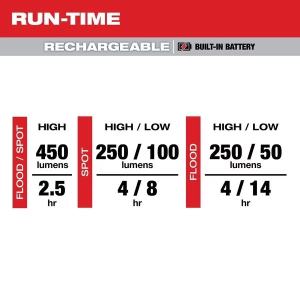 Rechargeable Headlamp, Battery Chemistry Lithium Ion, Includes Batteries Yes, Battery Size Proprietary, Number of Batteries 1, Includes Charger No, Beam Pattern Flood, Spot, Body Color Black, Red, Body Material Plastic, Number of Light Output Modes 5, Maximum Beam Distance 70 m, Maximum Brightness 450 lm, Run Time at Maximum Brightness 2.5 hr, Weight with Batteries 3.6 oz, Battery Location Back, Rechargeable Yes, Beam Focus Adjustable, Includes Secondary Light Yes, Head Adjustability Adjusted
