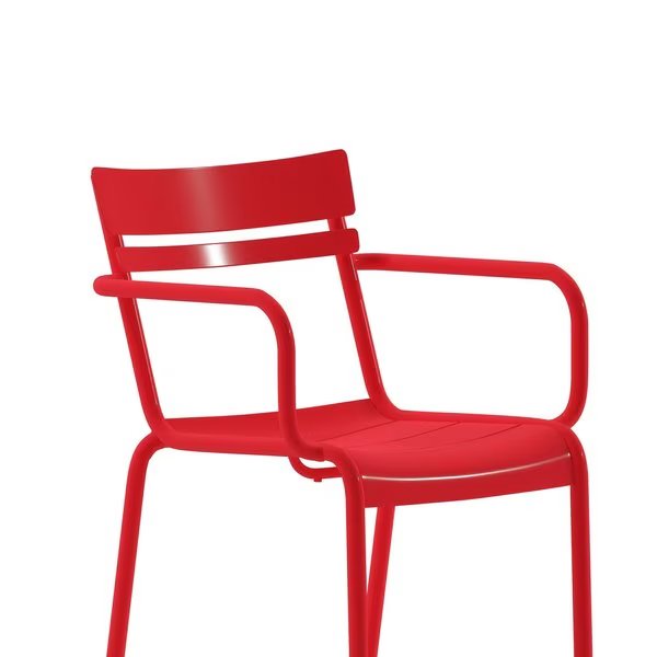 Sleek modern style is upwardly mobile and affordable with this modern commercial grade stack chair with arms. Ideal for any indoor or outdoor space at your restaurant, bar, kitchen, or patio the slatted, contoured design of the back and seat aids with airflow and water drainage for comfort and quick turnaround for seating. The rounded arms relieve pressure from the neck and shoulders for full relaxation. Rising to the demands of the hospitality industry, as well as your home, this steel chair boasts a powder coated frame that is UV and weather resistant and holds up to 300 lbs. static weight. Lightweight and agile with a recommended stack height of 8 chairs, this bistro chair wipes clean with a damp cloth for quick easy cleanup at the end of the night. Convenience is key in busy establishments and households so this chair ships fully assembled for instant use right out of the box. Protective floor glides keep your indoor flooring surfaces free from damage making this kitchen chair a winner from all angles. Available in multiple colors, pair this dining chair with our metal armchair and bar height stool for a cohesive look throughout your home or business.
