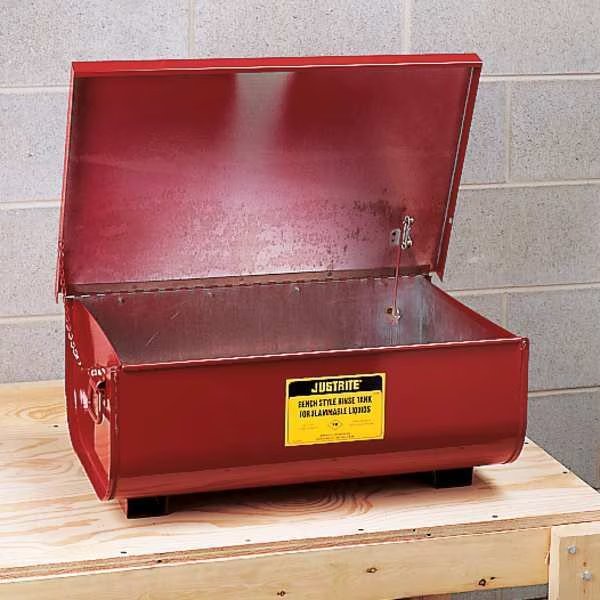 Rinse Tank, Capacity 11 gal, Safety Can Mounting Style Benchtop, Can Material Steel, Material Finish Powder Coated, Color Red, Overall Height 8 3/4 in, Number Of Chambers 1, Cleaning Tank Type Rinse Tank, Includes Fusible Link, Length 24 in, Lid Features Fusible Link, Product Type Parts Rinse Tank, Standards FM, Width 16 in