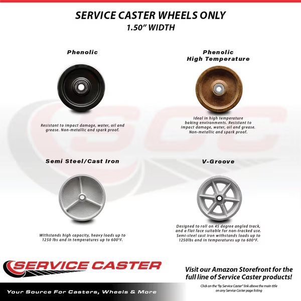 Listing is for one (1) Service Caster 3.25" diameter by 1.5" tread width phenolic wheel with 1/2" bore. Supports 600 pounds (lbs) per wheel.When searching for a reliable and durable solution for new applications or as a replacement wheel for casters and dollies, consider Service Caster’s Phenolic resin wheels. With a plain 1/2" bore for axle, phenolic wheels have a high resistance to impact damage while providing protection for floors in commercial and industrial settings. These easy rolling wheels are quieter than comparable steel wheels. Phenolic resin wheels feature a resistance to water, oil, and grease. Being non-metallic, these resin wheels are also spark proof. Hardness scale 90 Shore (D) Durometer. Service Caster is unsurpassed in quality, reliability, and excellent customer service. Count on us to move you forward.