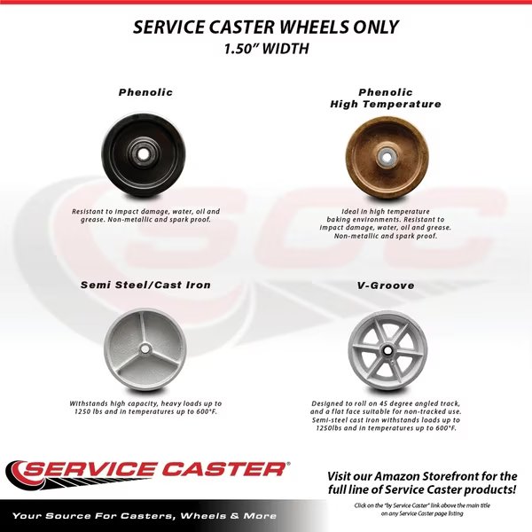 Listing is for one (1) Service Caster 6" diameter by 1.5" tread width high temperature phenolic wheel with roller bearing and 3/8" bore. Supports 600 pounds (lbs) per wheel.When searching for a reliable and durable solution for new applications or as a replacement wheel for casters and dollies, consider Service Caster’s High Temperature Phenolic resin. With a Roller Bearing with 3/8" bore for axle, high temperature phenolic wheels have a high resistance to impact damage while providing protection for floors in commercial and industrial settings. Phenolic is highly resistant to oil, grease, water, and most solvents. Hardness scale 90 Shore (D) Durometer. An excellent choice for bakers racks and baking carts. 475°F for 30 continuous minutes. Longer durations under high heat will decrease the lifetime of the caster wheel. Service Caster is unsurpassed in quality, reliability, and excellent customer service. Count on us to move you forward.