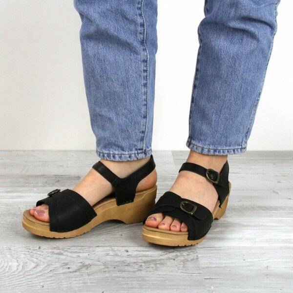 Pebbled/oiled leather open-toe sandal with adjustable strap and front buckle. Rocker Bottom. APMA approved. Adjustable strap with buckle. Anatomically correct footbed with microfiber insole