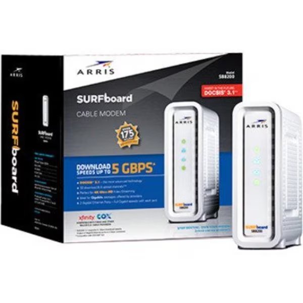 Introducing the first DOCSIS 3.1 cable modem in the SURFboard lineup. The SURFboard SB8200 is a DOCSIS 3.1 modem – the newest technology being offered by cable providers. It is capable of download speeds up to 5 Gbps, perfect for things like 4K Ultra-HD video streaming and Virtual Reality gaming! Plus, it has 2 Gigabit Ethernet ports! Today’s connected home demands speeds far more powerful than ever. Power your home network with the SB8200 and get the fastest speeds and most reliable connection to the Internet. Own yours today and stop paying rental fees. Capable of the fastest download speeds available from cable providers. The DOCSIS 3.1 cable modem – the newest technology currently being offered. Has download speeds up to 5 Gbps with 32 download x 8 upload channels. Perfect for 4K Ultra-HD Video Streaming and Virtual Reality Gaming. Ideal for Gigabit+ speed packages offered by cable providers and contains two 1-gigabit ethernet ports. Supports IPv4 and IPv6 Internet browsing standards and is compatible with Comcast and Cox Cable Internet providers ONLY. Other Cable Internet providers pending.