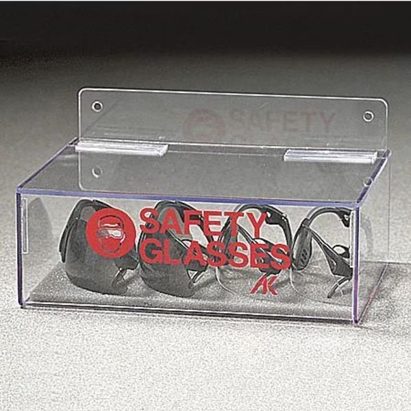 Safety Glasses Dispenser, Capacity 20 Pairs, Center-to-Center Mounting Hole Spacing 9 1/4 in, Color Clear, Dispenser Contains Glasses, Goggles, Dispenser Features Large Capacity, Dispenser Layout 1 Compartment, Dispenser Orientation Horizontal, Dispenser Style Tray, Dispensing Method Hinged Lid, Material Polyethylene, Message Safety Glasses, Mounting Location Wall; Tabletop; Countertop, Number of Compartments 1, Overall Depth 9 1/2 in, Overall Height 7 in, Overall Width 11 1/2 in
