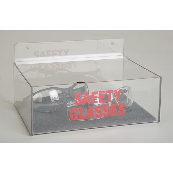 Safety Glasses Holder, Capacity 8 Pairs, Center-to-Center Mounting Hole Spacing 6 7/8 in, Color Clear, Dispenser Contains Glasses, Goggles, Dispenser Features Foam Pad, Dispenser Layout 1 Compartment, Dispenser Orientation Horizontal, Dispenser Style Tray, Dispensing Method Open, Includes Foam Pad, Material Polyethylene, Message Safety Glasses, Mounting Location Wall; Tabletop; Countertop, Number of Compartments 1, Overall Depth 6 3/4 in, Overall Height 3 1/4 in, Overall Width 9 in
