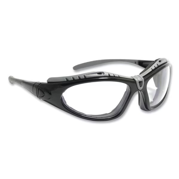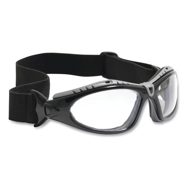 Comes with both temples and elastic headband strap. Temples and strap snap in or out; easily converts from a safety glass to a dust goggle and back. Clear lens with elegant black frame and anti-fog/anti-scratch coating. 8 base curve lens, ideal for harsh environment. Goggle includes flame resistant soft foam padding to keep out dust and airborne particles. Nylon temples with rubber tips for a secure fit.