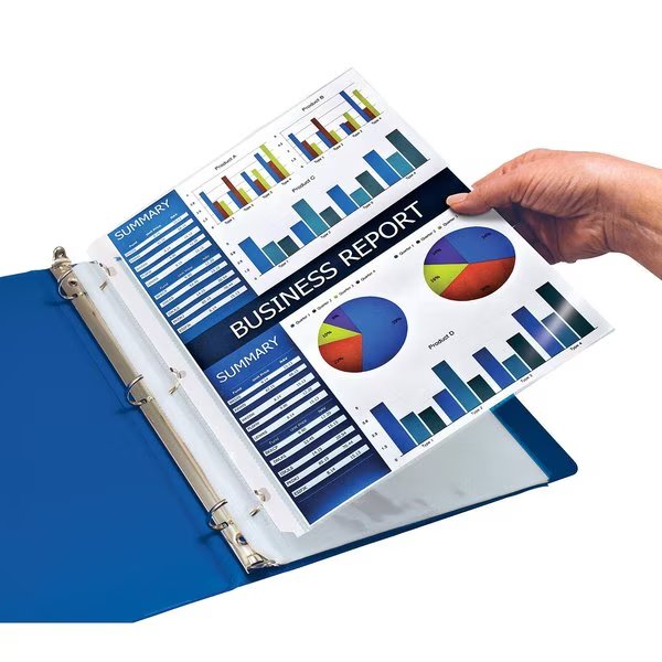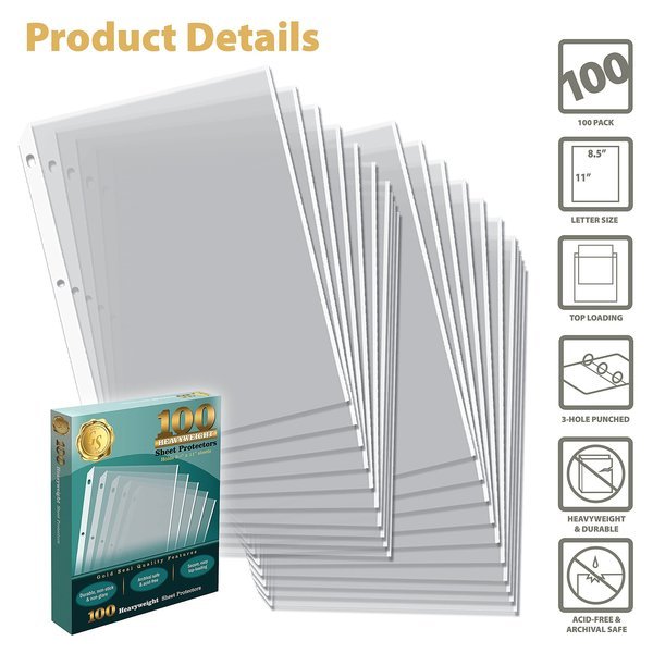 Clear HEAVYWEIGHT poly sheet protectors, 8.5in. x 11in.; Archival safe and acid free; Top loading for easy page insertion; Durable, nonstick and non-glare; 3-Hole punched margins have doubly-reinforced edges for added durability; white in color for higher visibility