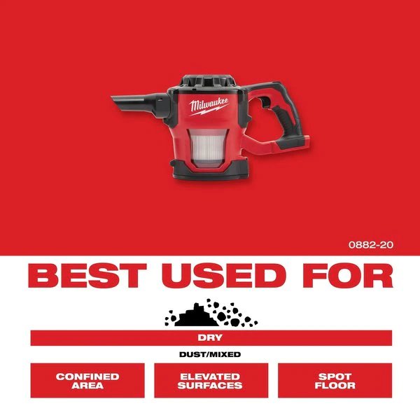 M18 Compact Vacuum Kit, 4 ft Hose, 2 Extension Wands, Crevice Tool, Floor Tool, Hepa Filter, Milwaukee Tool, Mfr#: 0882-20