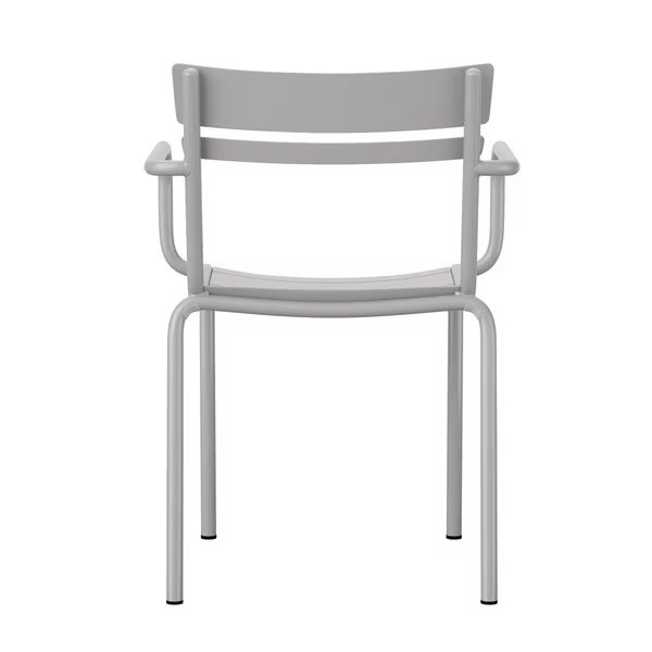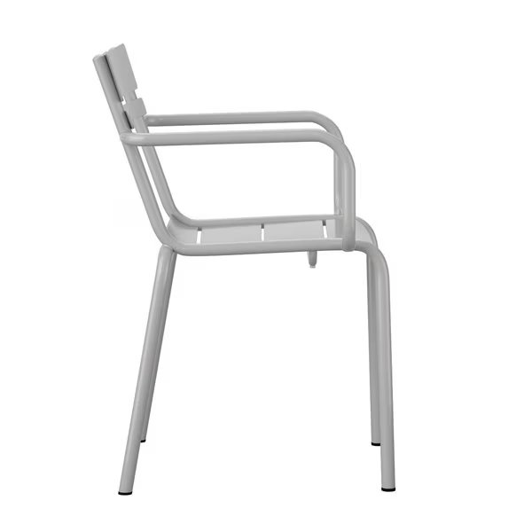 Sleek modern style is upwardly mobile and affordable with this modern commercial grade stack chair with arms. Ideal for any indoor or outdoor space at your restaurant, bar, kitchen, or patio the slatted, contoured design of the back and seat aids with airflow and water drainage for comfort and quick turnaround for seating. The rounded arms relieve pressure from the neck and shoulders for full relaxation. Rising to the demands of the hospitality industry, as well as your home, this steel chair boasts a powder coated frame that is UV and weather resistant and holds up to 300 lbs. static weight. Lightweight and agile with a recommended stack height of 8 chairs, this bistro chair wipes clean with a damp cloth for quick easy cleanup at the end of the night. Convenience is key in busy establishments and households so this chair ships fully assembled for instant use right out of the box. Protective floor glides keep your indoor flooring surfaces free from damage making this kitchen chair a winner from all angles. Available in multiple colors, pair this dining chair with our metal armchair and bar height stool for a cohesive look throughout your home or business.