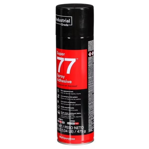 Spray Adhesive, Adhesive Color Clear, Container Size 16.75 oz, Container Type Aerosol Can, Product Type Spray Adhesive, Series Super 77, Spray Pattern Mist, Working Time 15 sec, Features Fast and Aggressive Tack, Heat Resistant No, High Tack Yes, Interior/Exterior Interior Only, Low Odor No, Standards MMM-A-1055B, VOC Content Weight 548 g/L, Water Resistance Not Water-Resistant, Materials Bonded Cardboard, Carpet, Felt, Foil, Paper, Pressure Sensitive No, Primary Applications General Purpose