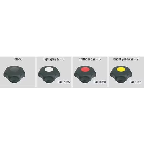 Star Grip Similar To DIN 6336 D=10-32, D1=25 H=16, Form: K, Tapped Bushing with Cap, Thermoplastic Black, Components: Stainless Steel Cap: Yellow. Note: all KIPP measurements are expressed in millimeters (mm) except for threads and bores on inch products, which are expressed in inches.