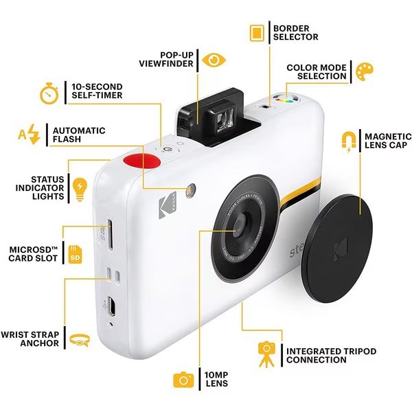 Step Digital Instant Camera with 10MP Image Sensor, ZINK Zero Ink Technology - Black, Kodak, Mfr#: RODIC20W