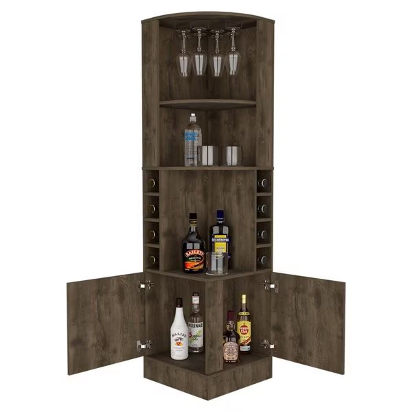 Stand out from the rest with the Tuhome Syrah Corner Bar Cabinet. Fitting neatly into a corner, this fashionable piece of furniture can store some liquor bottles. The built-in stemware rack allows you to hang four wine or cocktail glasses. Eight cubbies 4,4 in. H X 4,4 in. W line the unit, four on each side. Premium display space in the center for spirits is sure to catch the eye of any guests. Two large cabinet spaces at the base of the unit are perfect for storing liquor, cocktail books, or decorative accents in view but out of the way.With a ideal size 18,4 in. W X 18,4 in. D X 71,1 in. Hand unique desgined of dark brown manufactured wood finish.