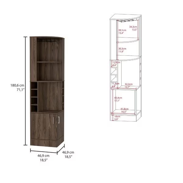 Stand out from the rest with the Tuhome Syrah Corner Bar Cabinet. Fitting neatly into a corner, this fashionable piece of furniture can store some liquor bottles. The built-in stemware rack allows you to hang four wine or cocktail glasses. Eight cubbies 4,4 in. H X 4,4 in. W line the unit, four on each side. Premium display space in the center for spirits is sure to catch the eye of any guests. Two large cabinet spaces at the base of the unit are perfect for storing liquor, cocktail books, or decorative accents in view but out of the way.With a ideal size 18,4 in. W X 18,4 in. D X 71,1 in. Hand unique desgined of dark walnut manufactured wood finish.