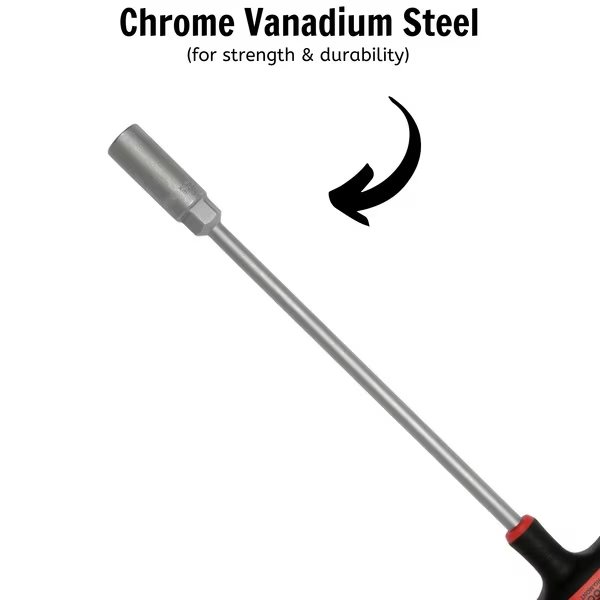 Mega Drive T Handle nut driver. Features a 6 point opening, ergonomically designed two component handle with hanging hole and a chrome vanadium steel shank.
