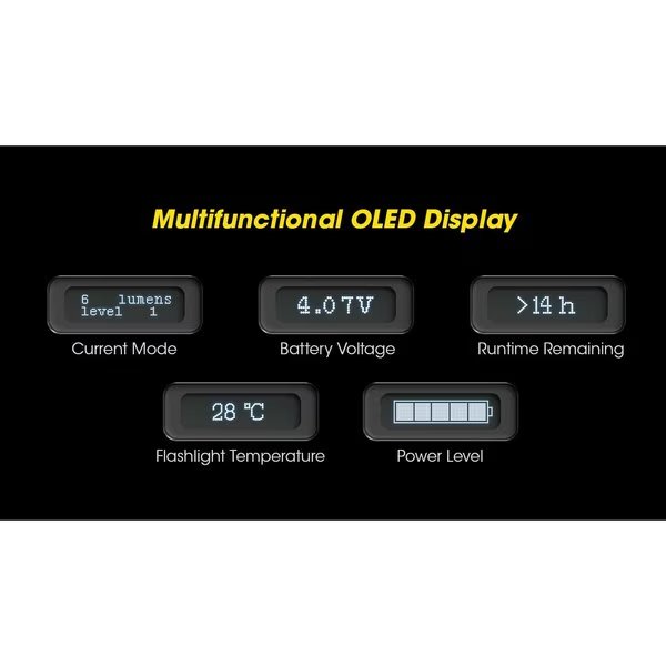 - •USER FRIENDLY INTERFACE - Separate power and mode buttons to power on/off and change brightness with real time OLED display for brightness output, battery level, remaining runtime, and temperatures.