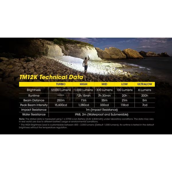 - •SUPER BRIGHT FLASHLIGHT - the TM12K is the ultimate rechargeable flashlight with a 12,000 lumen beam that can reach up to 273 yards.