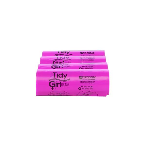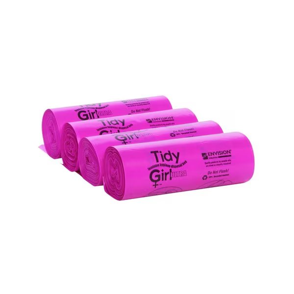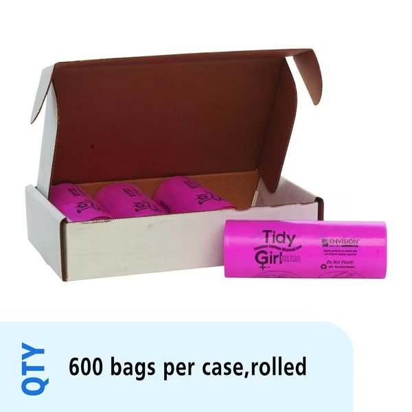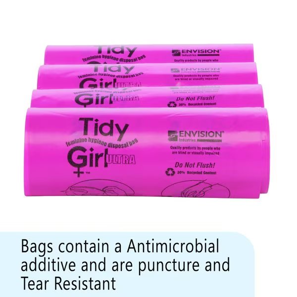 Stout by Envision TidyGirl feminine disposal bag dispenser Established in 1933, Envision offers high quality products at competitive prices while providing the ability to improve the quality of life for the blind and visually impaired through employment, outreach, rehabilitation, education and research TidyGirl feminine disposal bags are the answer to maintaining clean and sanitary conditions to all restroom facilities Save time and keep bathroom stalls fresh and sanitary These convenient, userfriendly plastic bags encourage proper sanitary disposal of all feminine hygiene products, diapers and wipes 600 pink colored bags per case 4 Rolls of 150 ea Antimicrobial additive, Prevents crosscontamination, Odor control, Prevents clogged toilets, Convenient, coreless rolls, Tear and puncture resistant, 30 recycled content, Printed, easytofollow directions Case of TidyGirl Feminine Disposal Bag Refills, Antimicrobial additive, Odor control, 30 recycled content,