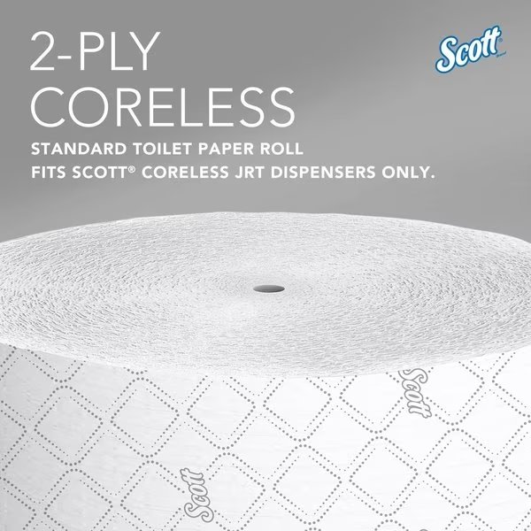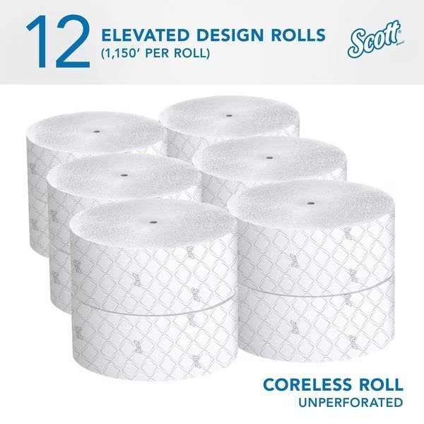 Scott(R) Essential(TM), Toilet Paper Roll, 2 Ply, Sheet Size Continuous, Continuous, Roll Length 1,150 ft, Roll Dia. 9 3/8 in, Proprietary, 3 3/4 in Sheet Width, Continuous Sheet Length, Coreless Core Dia., White, Compatible Grainger Part Number 40AY37, 506K77, 506K91, 60HV82, 60HV83, 60HV84, 60HV85, 60HV86, 60HV87, 60HV88, 60HV89, Compatible Mfg. Model Number 09601, 09602, 09603, 09608, 09609, 34831, 34832, 39709, 39730, 39731, 39732, Jumbo Coreless, Package Quantity 12