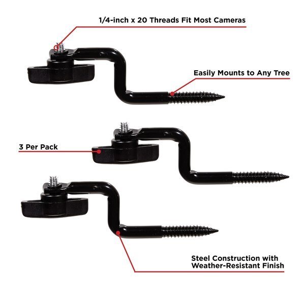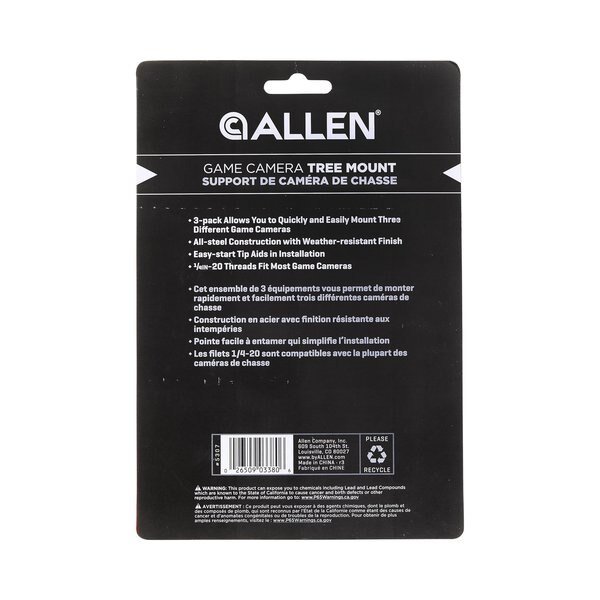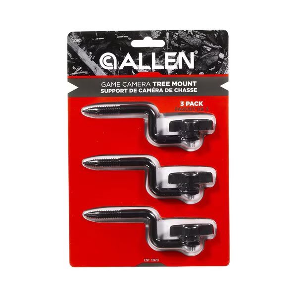 A three-pack of Trail Camera Mounts by Allen, featuring a standard camera mounting threaded thumbscrew. The Tapered screw allows for easy mounting to any tree. Three pack for multiple cameras or for changing a single camera location. Easily Mounts to Any Tree All Steel Construction with Weather-Resistant Finish 1/4-Inch x 20 Threads Fit Most Cameras Three Pieces Per Pack