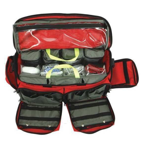 Trauma/Oxygen Bag, Height 12 in, Width 15 in, Length 27 in, Material 1000D Cordura, Red, Closure Type Zipper, Features Removable Trauma Stock Organizer, Molded Tuff Bottom Base, (4) Outside Pockets, (2) Elastic Loops, Access to Regulator Thru End Pocket, Clear Vinyl Pocket Inside Lid, Adjustable Shoulder Strap