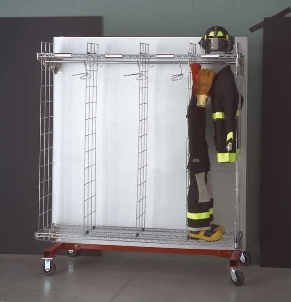 Turnout Gear Storage Rack, Wall Mount, Number of Sides 1, Number of Compartments 10, Compartment Size 18 in, Chrome, Overall Depth 21 in, Overall Height 78 in, Overall Length 180 in, Material Zinc Chromate, Includes (2) Hanging Hooks, Snap-On Plastic Name Plate with Slide-In Paper Label, (2) Levels Chrome-Plated Shelving and Dividers, Hanging Pole