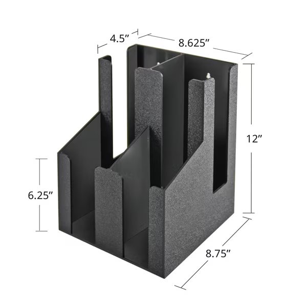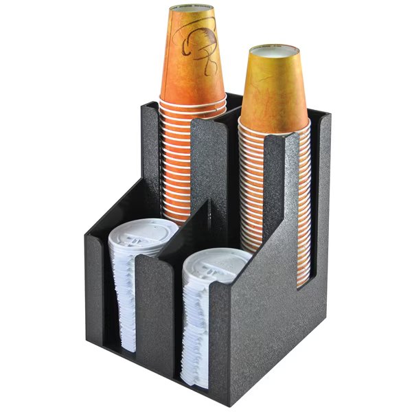 Azar's Black Two-Tier Four Compartment Organizer for Plastic Cups and Lids are perfect for keeping your beverage station tidy. This counter top or wall mount unit is designed to hold standard-sized, 4 in. diameter, Styrofoam or paper cups and plastic lids. The coffee caddie is great for restaurants, cafes, specialty shops, cafeterias, or the office break room. Keep drink supplies accessible and in a neat arrangement. Each caddie has two same size compartments for cups and two same size compartments for lids. This cup holder is made of durable plastic with a black speckled and textured finish exterior and a smooth black glossy finish on the inside. This design gives visibility to items so it is easy to monitor stock level. The unit has holes in the back so it can be mounted to the wall if desired hardware not included. Great space saver for use on the counter or wall. The unit is easy to clean and maintain. This storage unit is a great addition to any food service environment.