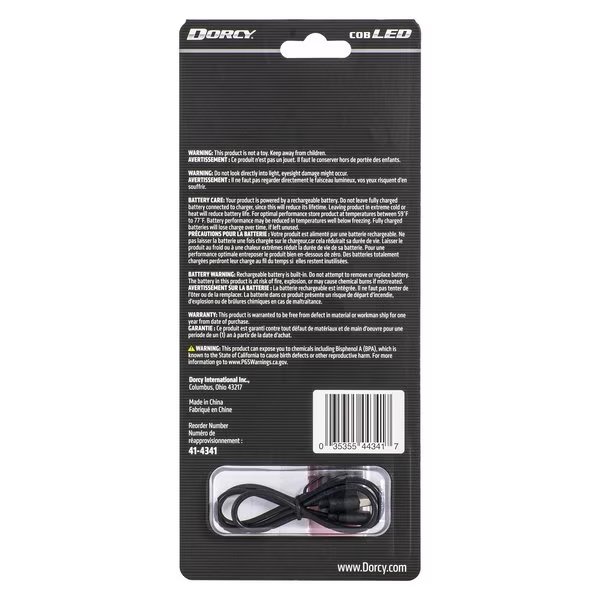 | Features | 200 Lumens High, 75 Lumens Low; 3.25 run time high, 4.75 run time low; Flashlight and COB area light, Magnetic swivel clip; Li-Ion battery and USB cable included. |