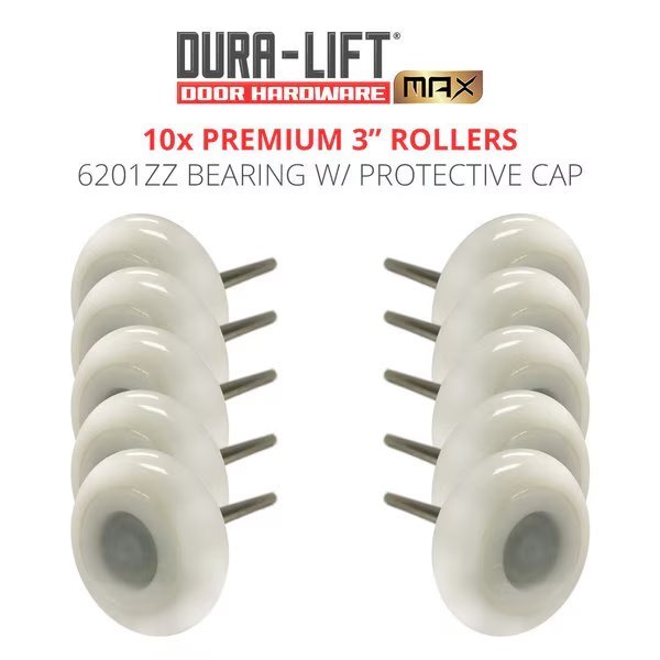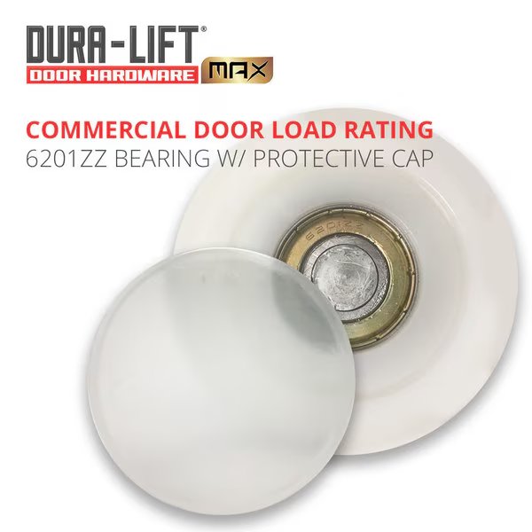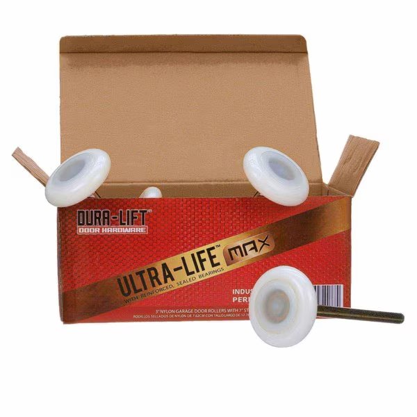 A replacement roller kit for old, noisy or broken garage door rollers on sectional, track-style garage doors. The DURA-LIFT Ultra-Life Max roller features a 2" nylon wheel with a 4" stem and a dual-caged 6201ZZ bearing with protective front and rear covering. This product is perfect for Do-It-Yourself garage door repair and maintenance.