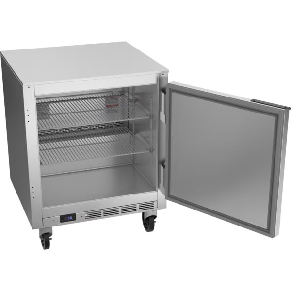 Undercounter Freezer, One Section, 27"W, 5.25 cu. ft. Capacity, Shallow Depth, (1) Solid Hinged Door, (2) Shelves, Stainless Steel Top with Turned Down Edges, Stainless Steel Exterior Top, Front, Sides & Doors, Galvanized Steel Exterior Bottom and Back, Aluminum Interior, Rear Mounted Self Contained Refrigeration, R290 Hydrocarbon Refrigerant, 1/4 HP Compressor, cULus, UL EPH Classified, UL-Sanitation