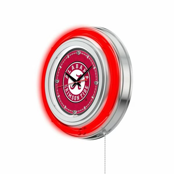 Our double neon Logo Clocks are the perfect way to show your school pride. Featuring a chrome casing and a team color specific neon outer ring that accents the custom printed clock face which is lit up by an brilliant white, inner neon ring. The Neon rings are easily turned on and off with a pull chain on the bottom of the clock, and are powered by a UL Listed power transformer that runs off standard 120V outlet. Accurate quartz movement ensures proper time and is powered by a single, AA battery (not included). Whether purchasing as a gift for a recent grad, sports super fan, or for yourself, you can take satisfaction knowing you're buying a clock that is proudly made by the Holland Bar Stool Company.