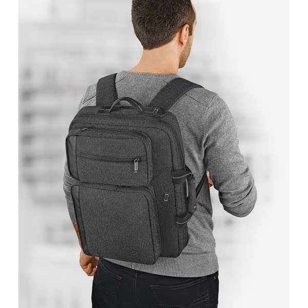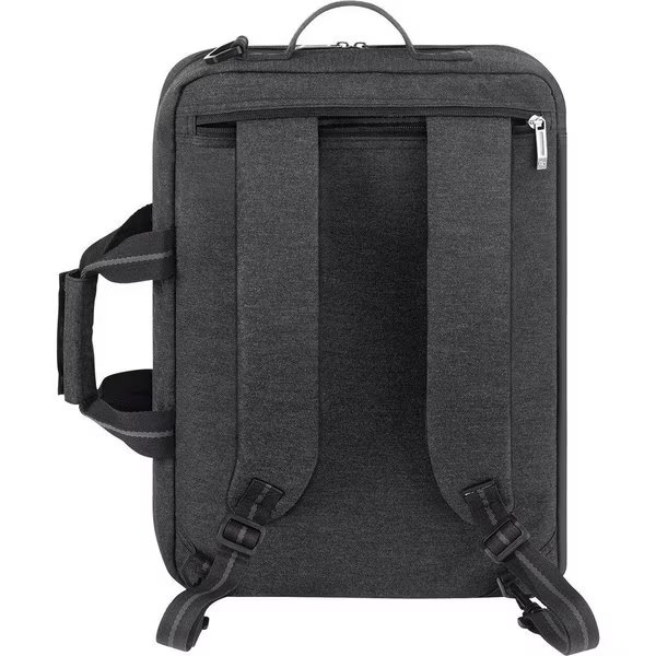 Hybrid briefcase transforms into a backpack to provide an easier way to travel. Padded compartment protects laptops with up to a 15.6" display from damage. Dedicated interior pocket is perfect for securing your iPad, tablet or eReader during travel. Front zippered pocket and front zip-down organizer section offer additional storage for chargers or personal items. Carry this case comfortably by the handles or removable/adjustable shoulder strap. Briefcase is made of a durable, polyester body that's strong and easy to clean.