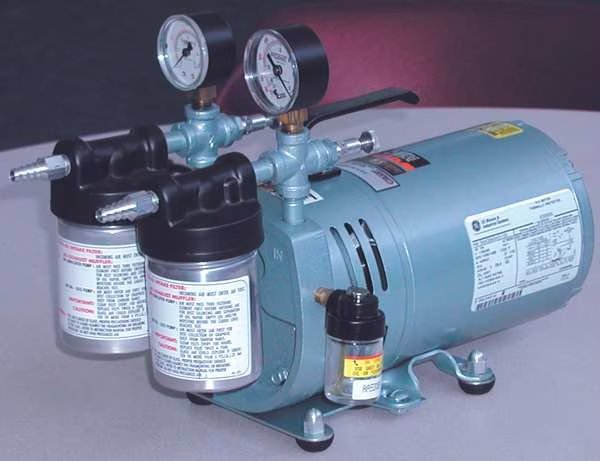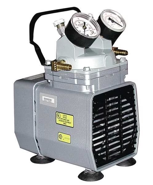Vacuum Pump, Output Power 0.25 hp, Phase Single, Voltage 115/208-230V AC, Inlet Size 1/4 in, Inlet Type NPT, Outlet Size 1/4 in, Outlet Type NPT, Free Air Flow Rate 4.2 cfm, Maximum Vacuum 26 in Hg, Maximum Speed 1,725 RPM