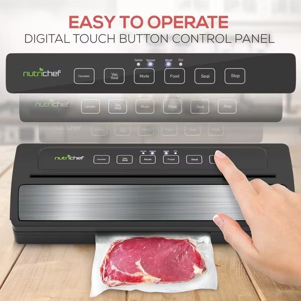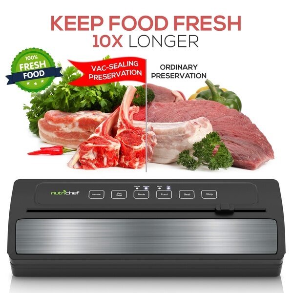 Features: - Automatic Vacuum Air Sealing Made Easy - Save Time & Money with Smart Meal Prep - Lab Tested to Effectively Increase Food Shelf Life - Simple Electric Plug-in Design with Hassle-Free Operation - Ability to Seal Dry & Moist Food Types - Integrated Roll Cutter for Custom Cut Bag Sizes - Selectable Air Seal Modes: ‘Gentle’ & ‘Normal’ Vacuum Sealing - Used for Dieting by Pre-Determining Food Portions - Creates Strong, Air-Tight Bags via Heat-Sealing - Re-Usable & Waterproof Air-Sealing Bags - High-Power Suction Element - LED Indicator Lights - Top Panel Digital Button Controls - Stain-Resistant & Easy-to-Clean Housing - Safe Placement on Any Kitchen Table/Countertop - Can Also be Used for Preserving/Waterproofing Non-Food Items What’s in the Box: - Vacuum Sealer - (5) Medium Vacuum Bags (7.8’’ x 11.8’’ -inches) - Long Vacuum Bag Roll (7.8’’ x 78.7’’ -inches) - Vacuum Air Hose Technical Specs: - High-Power Suction Element: 110 Watt - Vacuum/Suction Strength: 12L/min (-0.6 bar) - Vacuum Air Hose Length: 1.3’ ft. - Sealable Bags: Environmentally Friendly Polyamide - Withstands Food Temperature of 212°Fahrenheit Max. - *Vacuum Air Hose Connects to NutriChef Vacuum Seal Container Models: PKVSCN1L, PKVSCN2L (Sold Separately) - Construction Material: Engineered ABS, Stainless Steel - Power Cable Length: 3.3’ ft. - Power Supply: 120V - Dimensions (L x W x H): 14.4’’ x 5.5’’ x 3.0’’ -inches
