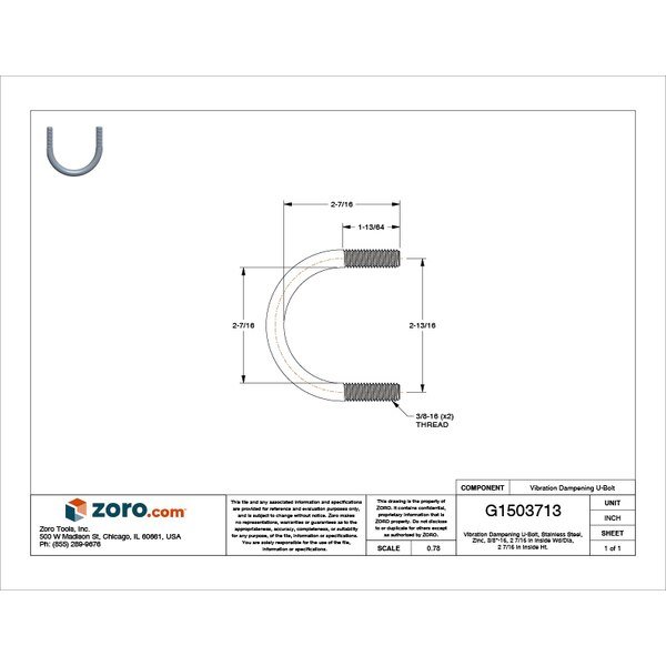 Vibration-Dampening U-Bolt, 3/8"-16, 2 7/16 in Wd, 2 7/16 in Ht, Plain Stainless Steel, Zsi, Mfr#: UB1-1/2PA6