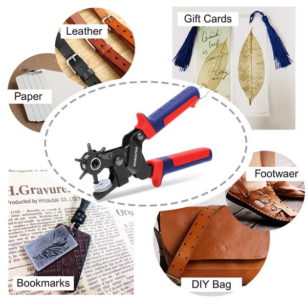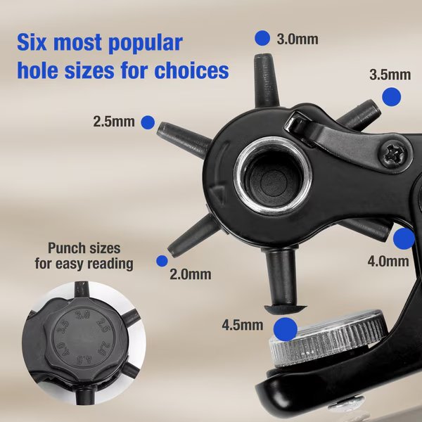 - •Multi-functional 6 round hole sizes: 2mm, 2.5mm, 3mm, 3.5mm, 4mm and 4.5mm, can be used for your different requirements on making eyelets in Leather, Belt, Watch Band, Cloth, Shoes, Handbag, Gaskets, Cardboard, Plastic, Pet Collar, ID Card, Cloth etc.