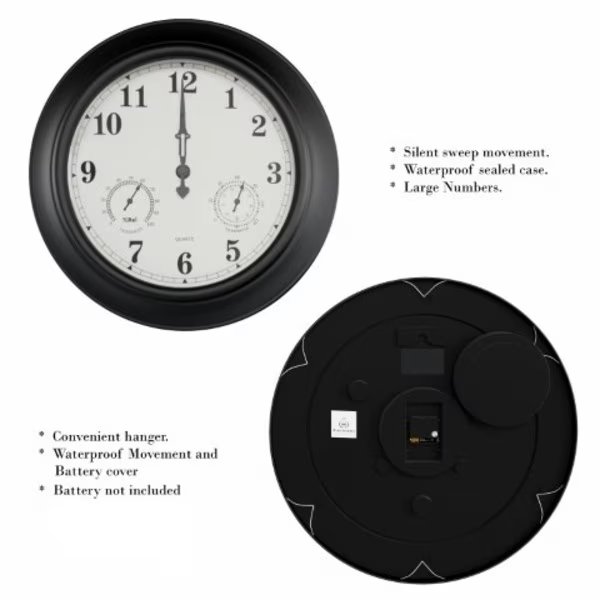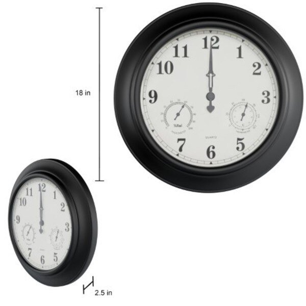 The Wall Clock Thermometer is a necessity for any home! This convenient piece features accurate quartz timekeeping and also measures both temperature and humidity; it's great to have in all seasons. With a sleek black finish, this hanging clock thermometer is a wonderful addition to any area of the home, indoors or outside; hang it by your pool patio, porch, deck, kitchen, or sunroom. Equipped with an 18-in display face, you can easily read the temperature at glance, while the waterproofing and sturdy steel construction ensures that the gauge will survive any weather conditions. It's an attractive and functional piece for your home!