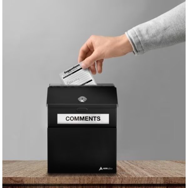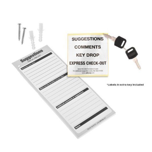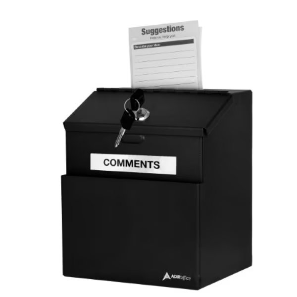 The AdirOffice Wall Mountable Steel Locking Suggestion Box is powder-coated with a scratch-resistant finish to last you for years to come. It can be easily mounted on the wall with included hardware or simply set down on any flat surface. With a secure lock to keep everything safe inside, it is for dropping off keys and payments after hours. A front pocket is ideal for holding pens, suggestion cards and small envelopes. Stick-on labels and 25 suggestion cards also included.