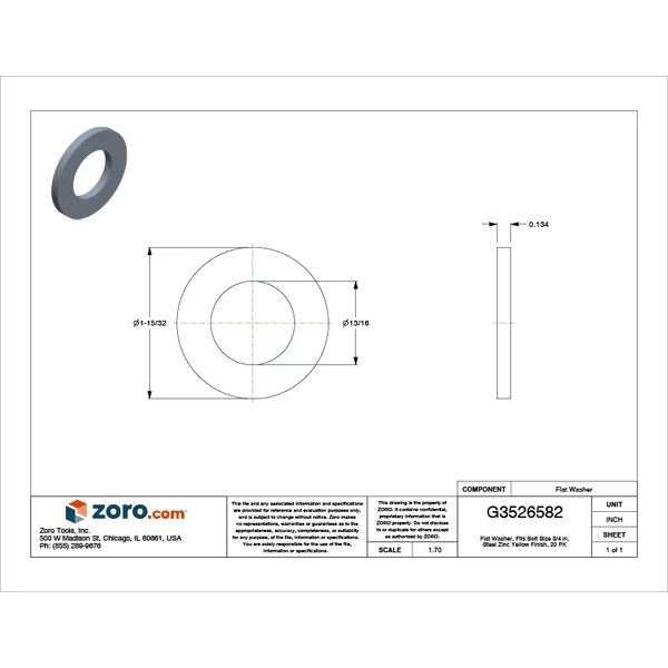 SAE Washer, Flat Washer Type SAE, Dimensional Standards ASME B18.22.1 Type A Narrow, SAE Standard, Material Steel, Material Grade/Class Grade 8, Finish Zinc Yellow, For Screw Size 3/4 in, Inside Diameter 0.813 in, Outside Diameter 1 15/32 in, Maximum Thickness 0.134 in, System of Measurement Inch, Minimum Thickness 0.134 in, Color Yellow, Material Quality Standards ASTM F436, Pack Size Small Pack, Rockwell Hardness 38HRC, Thickness Tolerance +0.026/-0.026 in, Package Quantity 20