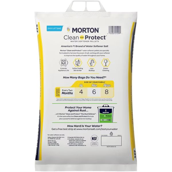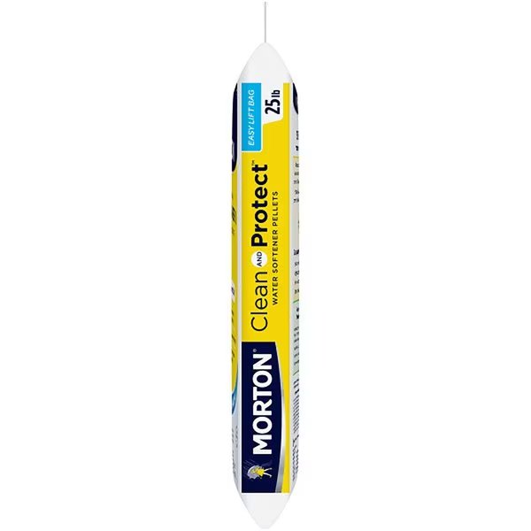 Morton® Clean and Protect® Water Softener Salt is formulated to prevent buildup in pipes and appliances helping to extend their life and improve efficiency. Plus we’ve created this lighter weight 25 lb. bag that features a sturdy plastic handle and easy-tear opening. For the many households that have hard water it is a solution for softer water that provides many added benefits. When used Morton Water Softener Salt Pellets help not only to decrease the buildup hard water can cause in pipes and appliances and make dishes easier to clean but also leaves hair and skin feeling softer after washing and bathing.To continue to see the benefits of Morton Water Softener Salt Pellets it is recommended that every two months you add between two and four new bags to your tank depending on the number of people in your household.