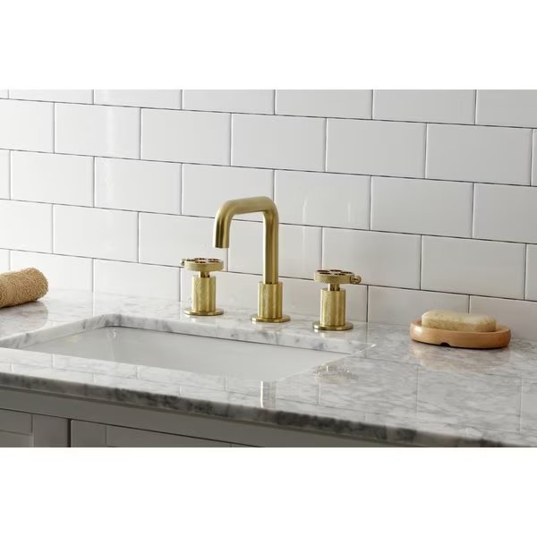 This faucet's modern features create a bold and edgy design in your bathroom Ideal for more spacious bathrooms, widespread faucets are more spread apart and feature a 3hole installation The Webb widespread bathroom faucet and its featured sturdy brass construction and premium brushed brass finish will glamorize your home's modern ensemble for years to come A matching finish push popup drain is also included