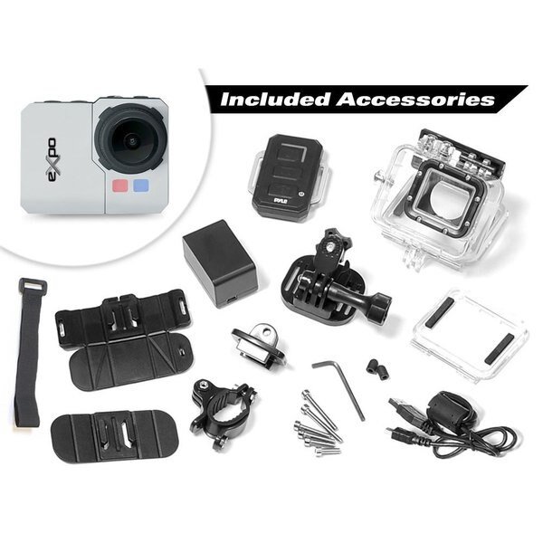 Features: - 2.0'' Digital LCD Display - Record Hi-Res 1080p Video - Capture Crisp 20 Mega Pixel Images - Download the 'Pyle eXpo' App: Snap Pics and Record with Your Smartphone - Micro SD Card Slot (Supports up to 32GB) - Motion Detector Recording Function - HDMI Mini Connection Port - Built-in Rechargeable Battery - Connect to PC and Share via USB - Includes Wi-Fi Remote: Wirelessly Snap Pics & Record Video - Marine Grade Waterproof Case: Safe for Depths up to 190 Feet - Includes (2) Removable Case Doors (Waterproof & Noise-Reducing) - Also includes USB charging cable, removable battery, Wi-Fi remote charging dock, bicycle mount and other fasteners/clip accessories - Self Timer, Burst Shots & Auto Shoot Features - 180 Degree Display Rotation for Upside-Down Mounting - Snap Pictures While Recording Video - Works with Mac and PC Technical Specs/Configuration: - Video Resolutions, Choose 1080p, 1080i, 960p, 720p or 480p - Video Frames Per Second: 60, 50, 30 or 25 - Image Resolution up to 4283 x 3288 pixels - Choose Between 20, 14, 5 Mega Pixel Images - Light Frequency Options: 50Hz, 60Hz - Exposure Metering: Spot, Center and Multi - ISO Settings: 100, 200, 400, 800, 1600 and Auto - White Balance: Auto / Incandescent / Daylight / Cloudy - Color Settings: Rich (0~3 m), Natural/Diving (3~15 m), Deep Sea (15m+) - Multi-Language Support: English, French, German, Spanish, Italian - Built-in Rechargeable Battery (1050mAh) - Battery Life: Approximately 1.5 Hours Recording Time - Wide Angle G-View Lens (f/2.4, Fixed Focus Glass Lens) - EV Setting: -2.0 -1.7 -1.3 -1.0 -0.7 -0.3 0.0 +0.3 +0.7 +1.0 +1.3 +1.7 +2.0 - Auto Screen Turn Off & Shutdown - Dimensions (L x W x H): 2.25'' x 1.5'' x 1.9'' The 'Pyle eXpo' App: - Download the App & Capture the Action Like Never Before! - Record Video and take Images with your Smartphone - Works with Android and Apple Devices - Works with iPhone, iPod, iPad (Compatible with iOS 4.0 & Later) - Also Works with Androids, Samsung, Galaxy, Nexus, etc. (Compatible with Android 4.0 & Later)