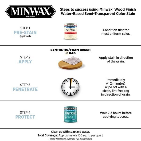 Minwax« Wood Finish« Semi-Transparent Color Stain is a penetrating water-based stain that opens up a world of possibilities with 200+ tintable color options in just one wood-grain-enhancing coat.